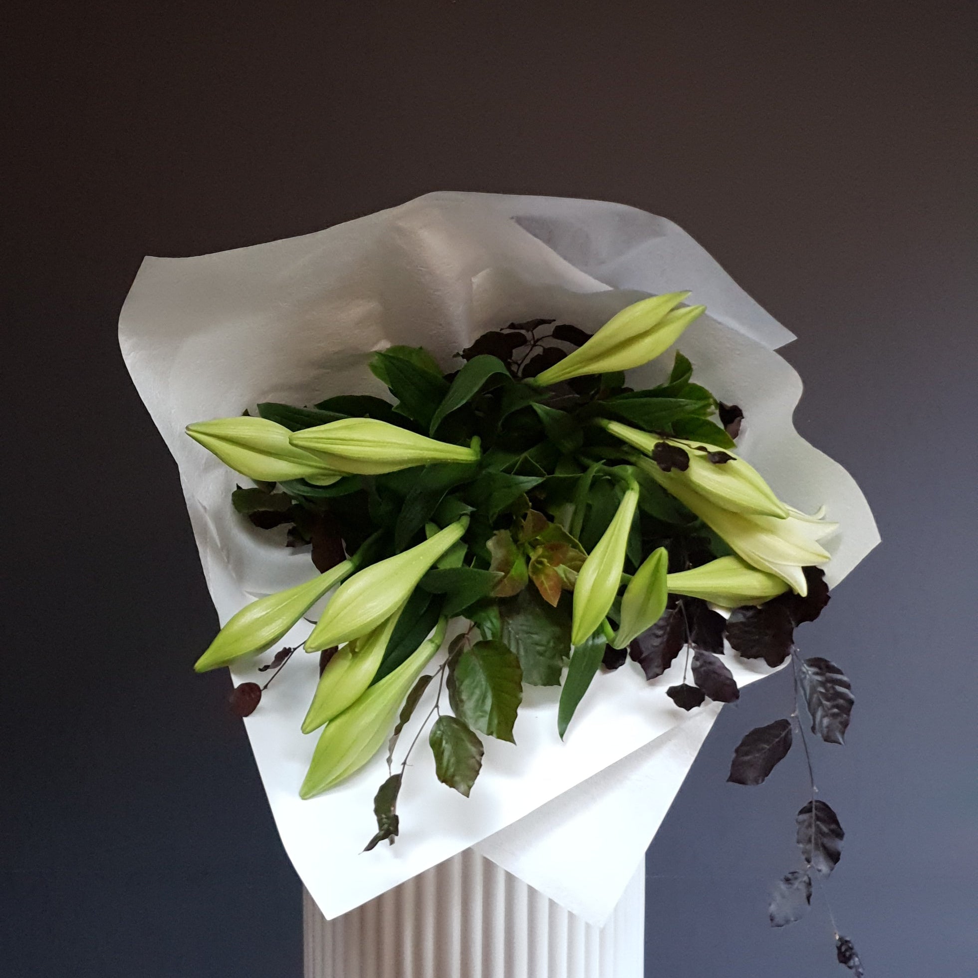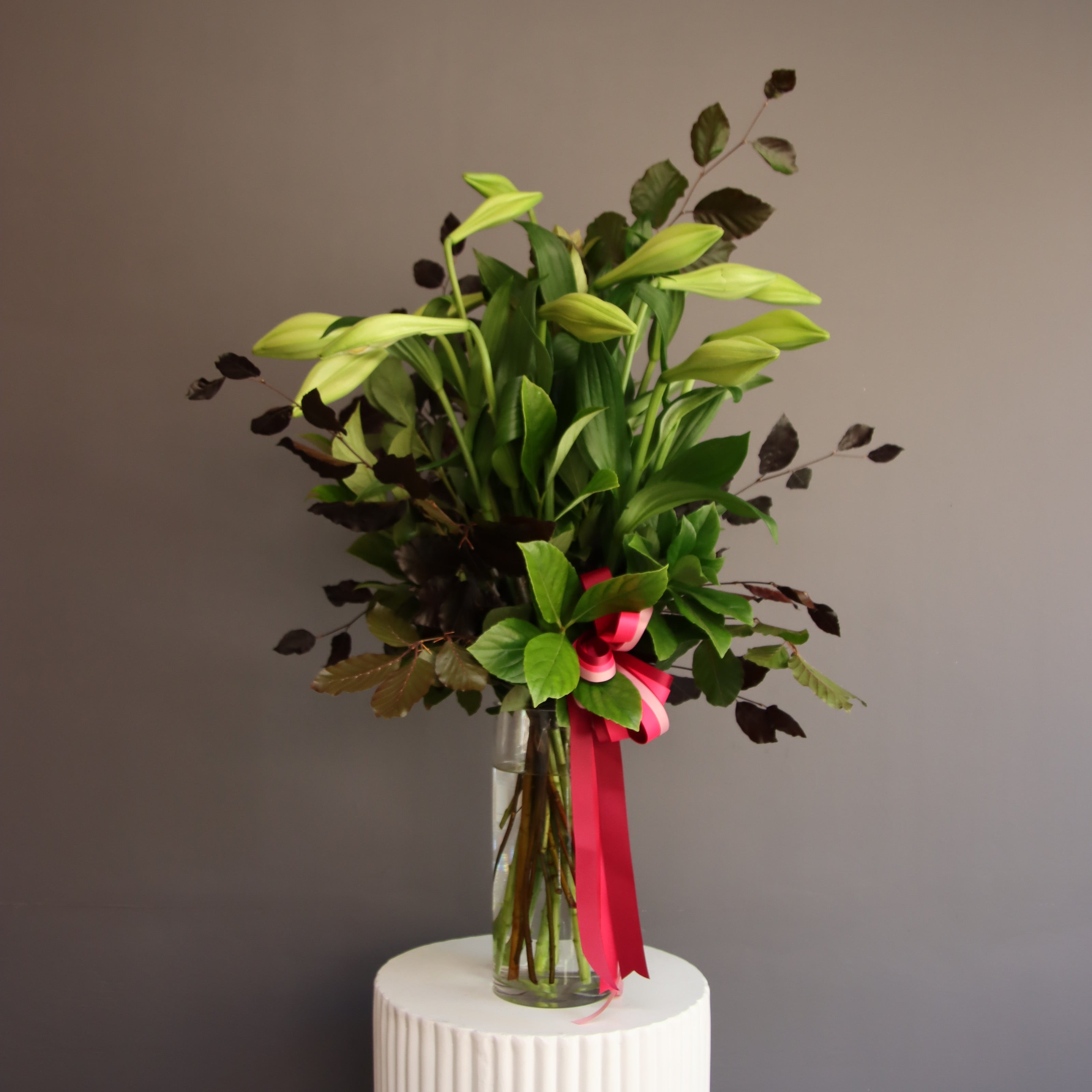 Stunning Christmas Lily Bouquet blends fragrant premium blooms with lush seasonal greenery. This sophisticated arrangement creates a memorable centerpiece or makes an exceptional gift for those you treasure.