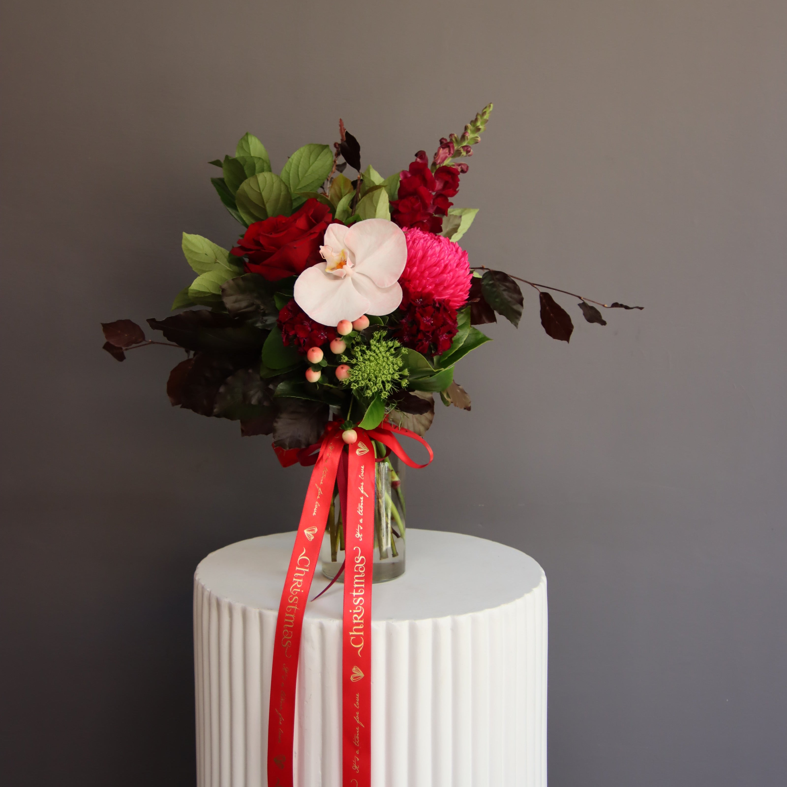 Festive seasonal blooms handtied into a delicate posy and nestled in a glass jar. A thoughtful, compact gift that brings Christmas charm to any home. Perfect for those seeking an elegant yet understated way to celebrate the season.