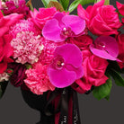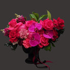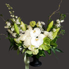 A luxe arrangement in a compote pot. Long lasting and beautiful full view arrangement in orchids and seasonal blooms.