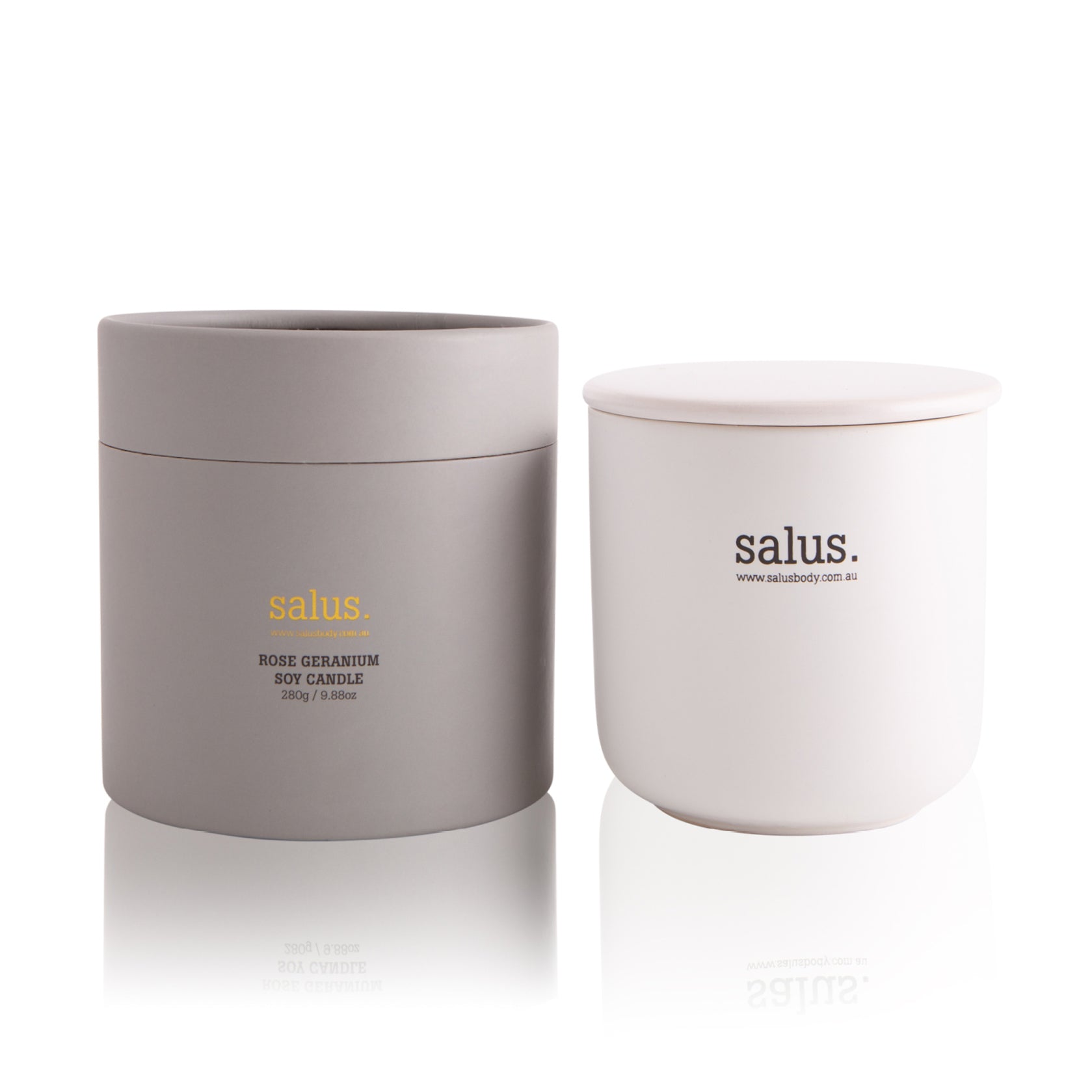 A calming blend of grounding oils and natural soy wax to soothe and relax the senses. Formulated with pure essential oils of rose geranium, lavender and cedarwood.