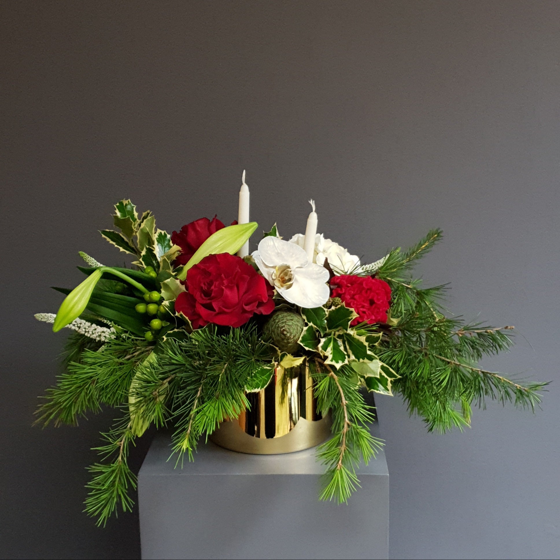 Bring festive charm to your dining table with our beautiful Christmas centerpiece. Featuring lush greenery and fresh seasonal blooms. Designed to capture the spirit of the season, this elegant centerpiece brings a festive charm to any table setting.