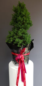A potted Christmas tree with a festive bow—ready to brighten your home or make a thoughtful gift this holiday season.