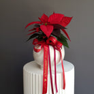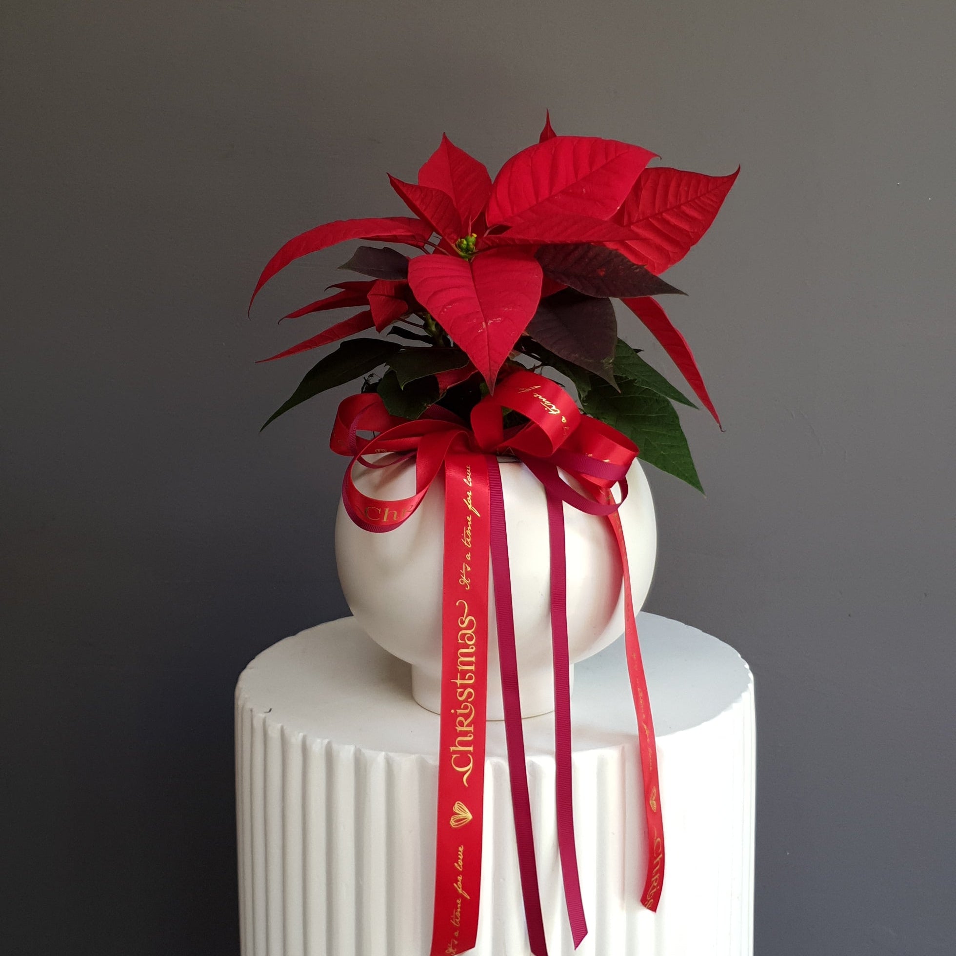 Vibrant poinsettia plant nestled in a charming ceramic fishbowl, accented with natural moss and elegant ribbons. Perfect for adding festive color to any space during the festive season.