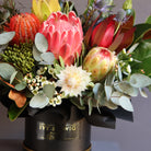 Contemporary & chic, our signature native hat box. An elegant & striking selection of native blooms, created as a front facing style, presented in a stylish round hat box.