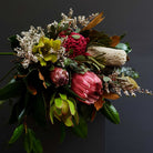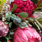 Contemporary & chic, our native style bouquet. An elegant & striking selection of native blooms, created as a front facing style bouquet, presented in stylish wrap & finished with luscious ribbon.