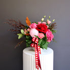 Romantic mixes of seasonal blooms, including lush greenery, beautifully presented in a lowline ceramic pot.